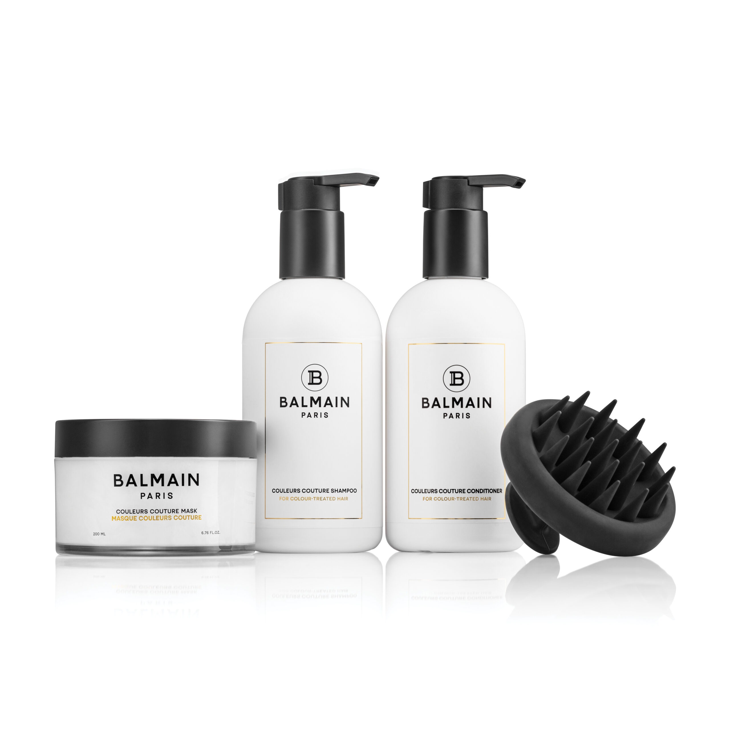 Couleurs Couture Care gjafasettið inniheldur þrjár vörur í fullri stærð, sjampó, hárnæringu og maska ásamt nuddbursta