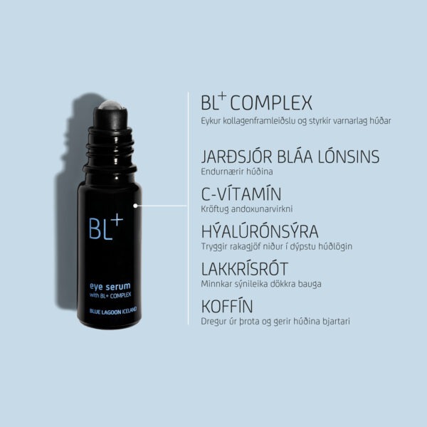 Áhrifaríkt augnserum sem veitir öflugan raka, vinnur á fínum línum og dregur úr einkennum þreytu og þrota á viðkvæmu augnsvæðinu. BL+ Eye Serum inniheldur einstaka samsetningu lífvirkra innihaldsefna sem vinna á dökkum baugum, örva kollagenframleiðslu í húð, draga úr niðurbroti kollagens auk þess að verja húðina gegn umhverfismengun með andoxunarvirkni. Með reglulegri notkun verður augnsvæðið rakafyllt, þéttara, og bjartara og frísklegra ásýndum.