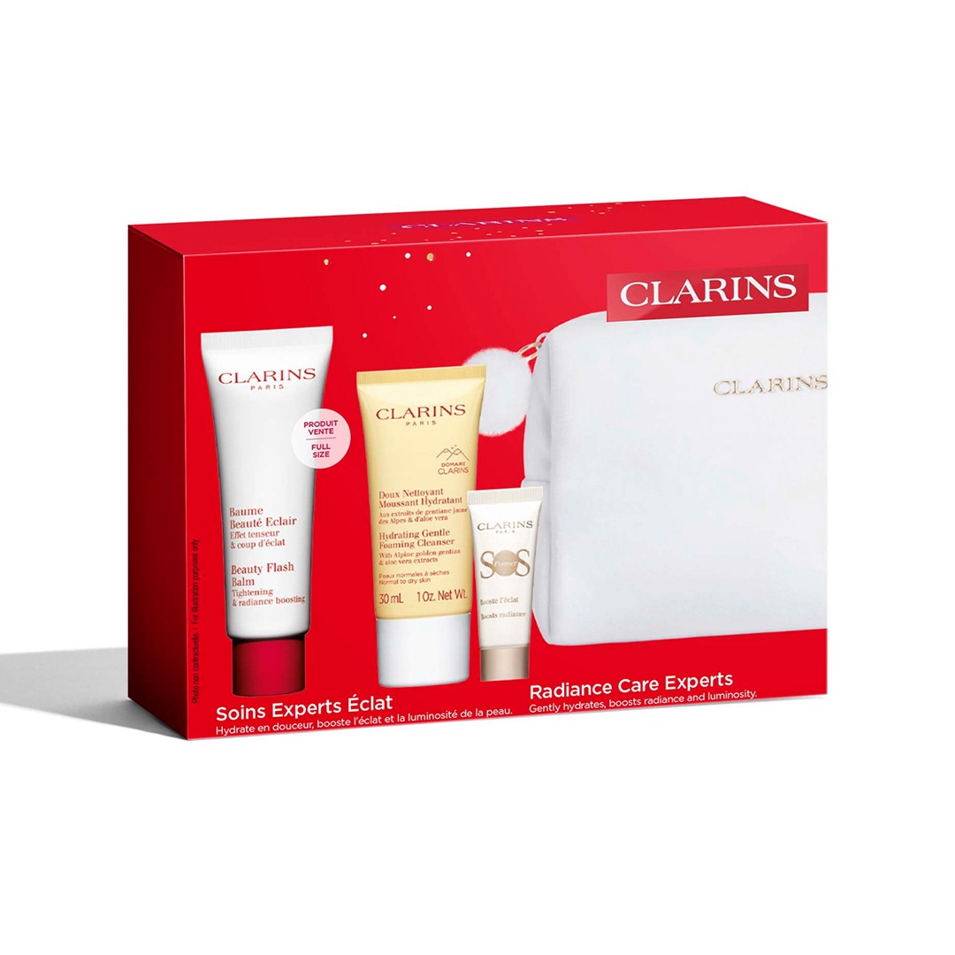 Gjafasettið inniheldur Beauty Flash Balm 50ml, Hydrating Gentle Foaming Cleanser 30ml og lúxusprufa af SOS Radiance Primer.
