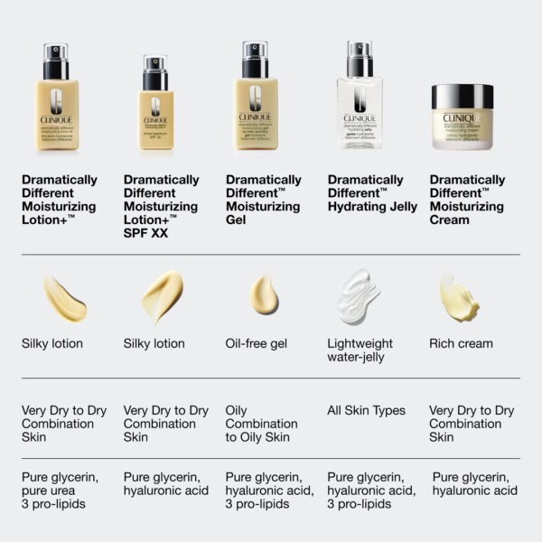 Skref 3 í þríþættri húðrútínu Clinique. Dramatically Different Moisturizing Lotion+ SPF 50 endurheimtir rakajafnvægi húðarinnar og gefur sólarvörn.