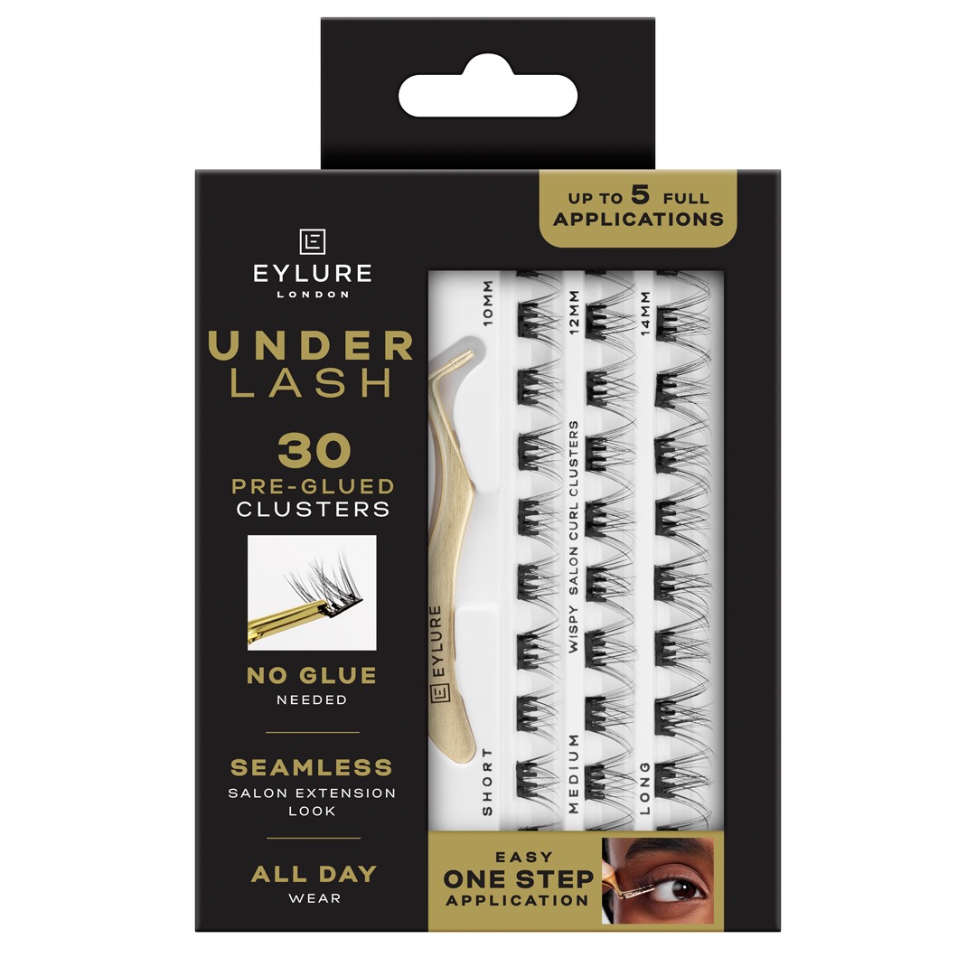 Underlash Pre-Glued Wispy Salon Curl Clusters er augnhárasett sem inniheldur 30 augnháraklasa og gylltan ásetjara. Augnhárin koma með lími á röndinni svo ásetningin er mjög auðveld og þægileg.