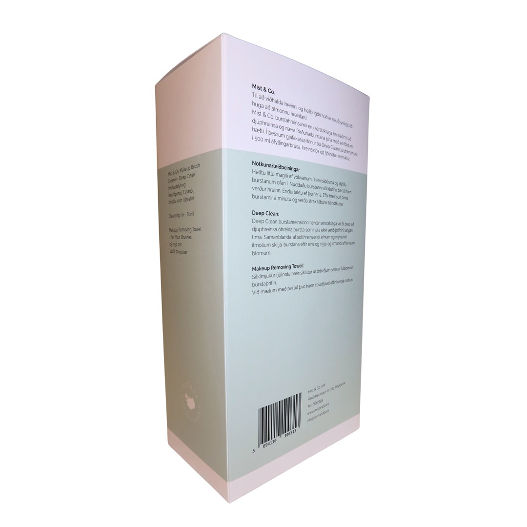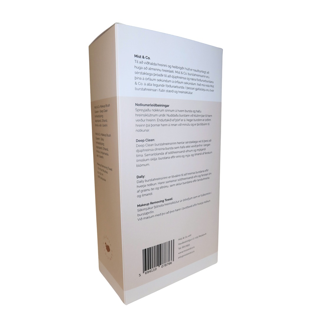 Mist & Co. Pro Kit er fullkominn pakki fyrir fagfólk og þá sem eiga marga förðunarbursta, pakkinn inniheldur þrjár vörur Mist & Co. Deep Clean 500ml, Mist & Co. Cleansing tin og Makeup Removing Towel – For Your Brushes.