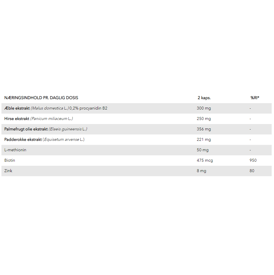 Hair Gro inniheldur Procyanidin B2 úr eplum, olíu úr ávexti pálmatrés, en þessi ávöxtur inniheldur tocotrienol, efni sem er í E vítamín fjölskyldunni og er þekkt fyrir að hafa jákvæð áhrif á almenna heilsu og sérstaklega öflugt vítamín fyrir hársvörðinn og hársekkina (hárrótina) þar sem ný hár myndast. Auk þess inniheldur blandan hirsi, amínósýrur, bíótín og sink sem stuðlar að viðhaldi eðlilegs hárs.