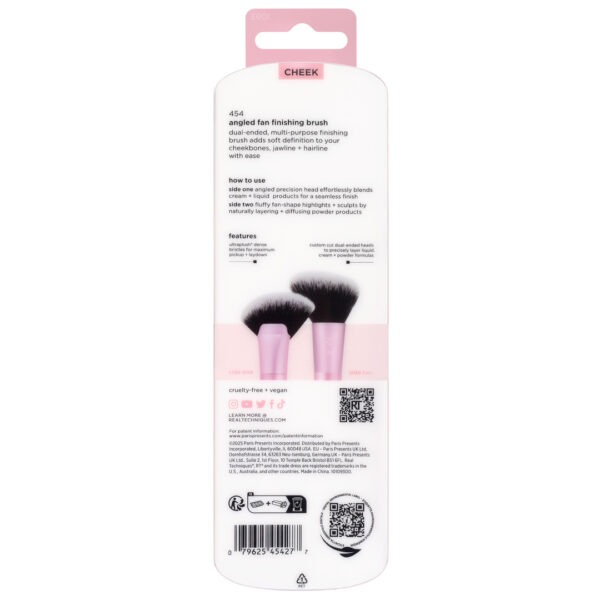 Angled Fan Finishing Brush er tvöfaldur mótunarbursti sem sameinar tvo burstaenda fyrir fjölbreytta notkun, þéttan haus sem hentar fullkomlega til að dreifa krem-, fljótandi og stiftformúlum, og mjúkan haus sem gefur létta og jafna áferð með púðurvörum. Burstarnir eru búnir ultraplush™ gervihárum sem tryggja silkimjúka áferð, og skaftið er í fullkominni lengd til að veita hámarksstjórn og nákvæmni við ásetningu. Þetta er fjölnota „finishing“ bursti sem auðveldar að fullkomna förðunina hvort sem notaðar eru krem- eða púðurformúlur.