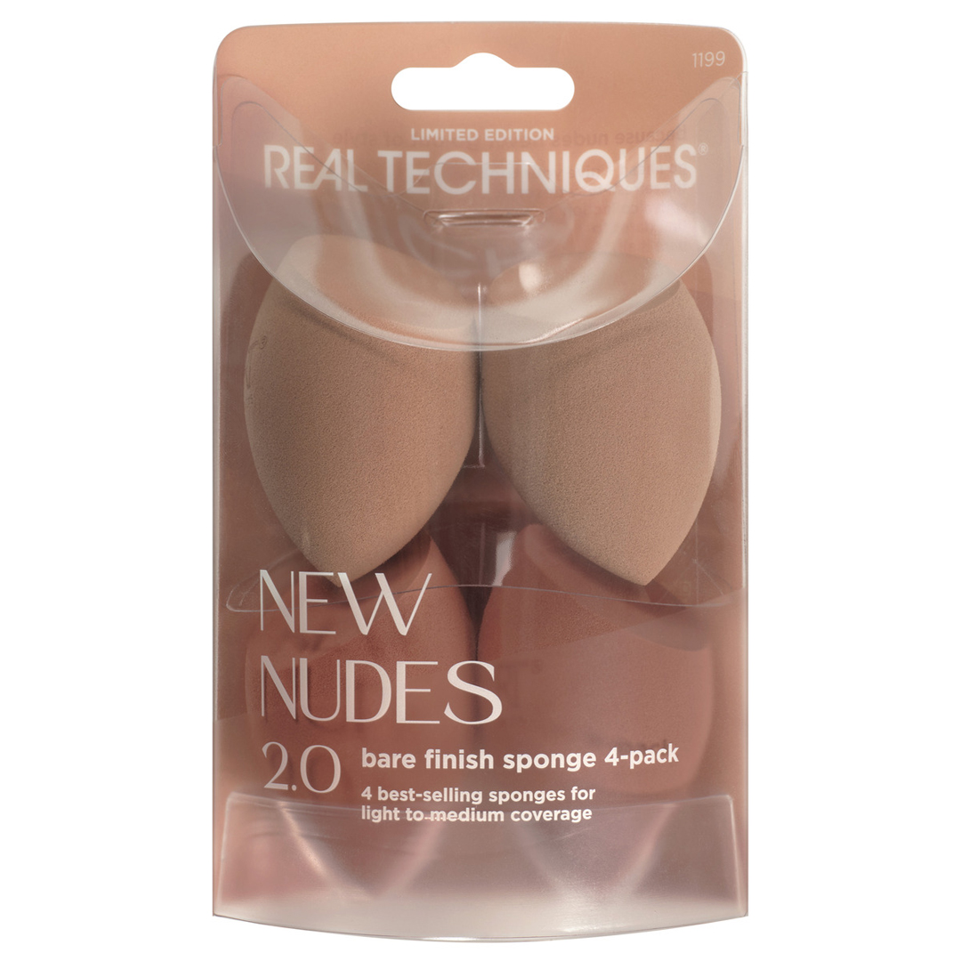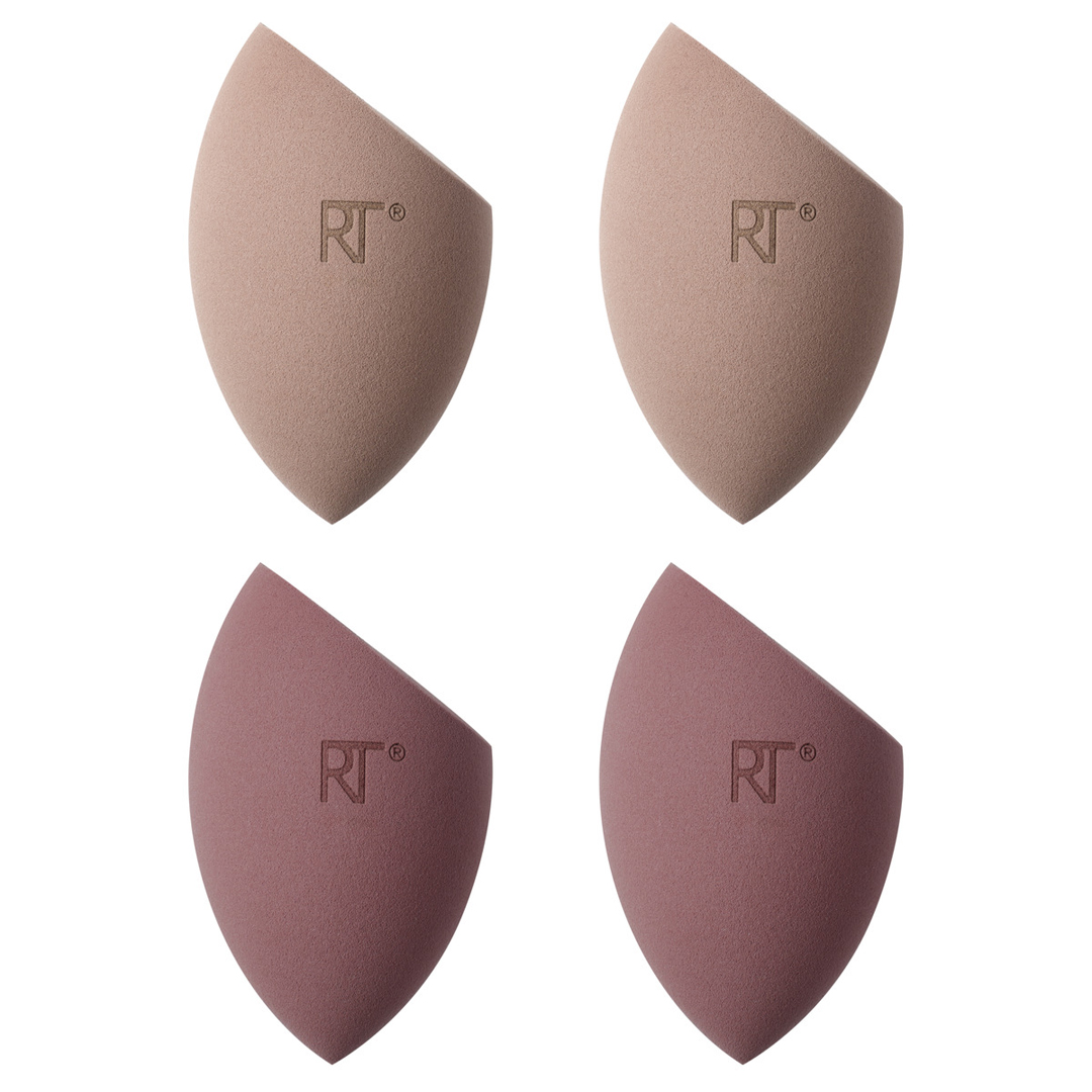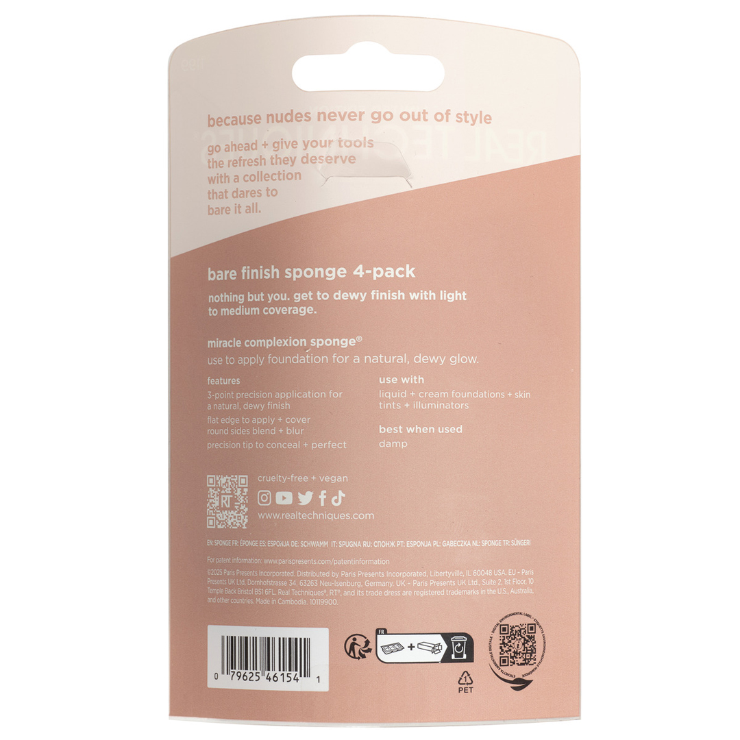 Real Techniques Bare Finish Sponge 4-Pack inniheldur 4 förðunarsvampa til að bera á farðagrunn og ná náttúrulegri, ljómandi áferð. Förðunarsvamparnir veita létta til miðlungs þekju sem lætur húðina líta ferska og vel nærða út, eins og þín eigin húð, en betri. Þrískipt lögun svampsins veitir nákvæma ásetningu, jafna blöndun og fullkomlega áferð: flati kannturinn gefur þekju, ávöl hliðin blandar farðanum og oddurinn hjálpar til við nákvæma ásetningu á minni svæði.