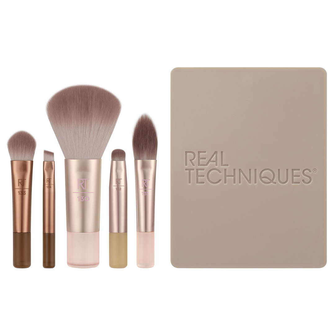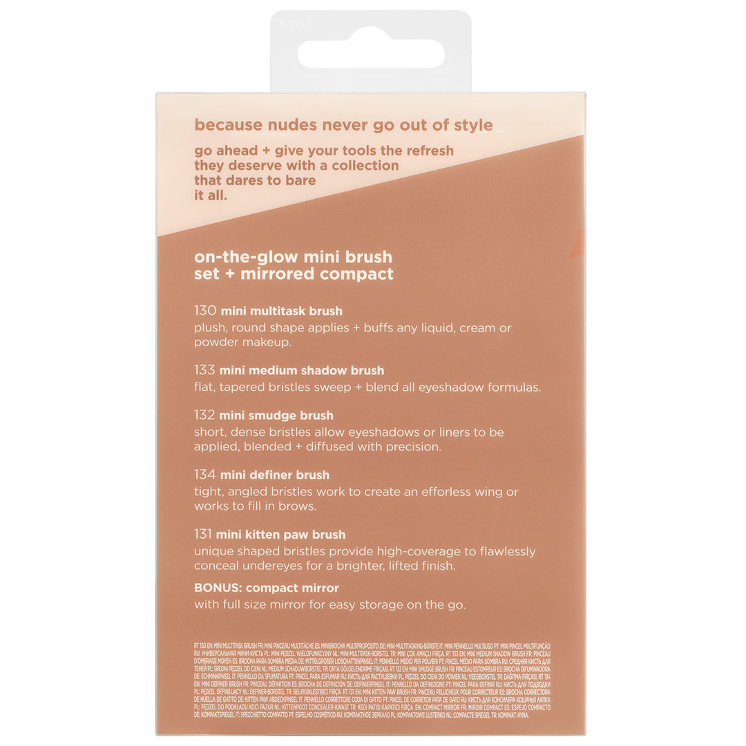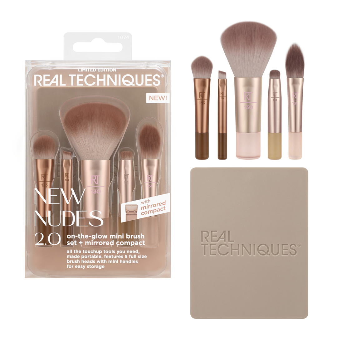 Real Techniques New Nudes 2.0 On-The-Glow Mini Makeup Brush Set + Mirrored Compact inniheldur alla förðunarbursta sem þú þarft til að laga förðunina í ferðavænni stærð. Þessi takmarkaða lína er komin aftur og betri en nokkru sinni fyrr. Burstasettið inniheldur 130 Mini Multitask Brush, 133 Mini Medium Shadow Brush, 132 Mini Smudge Brush, 134 Mini Definer Brush, 131 Mini Kitten Paw Brush og aukalega lítinn spegil.