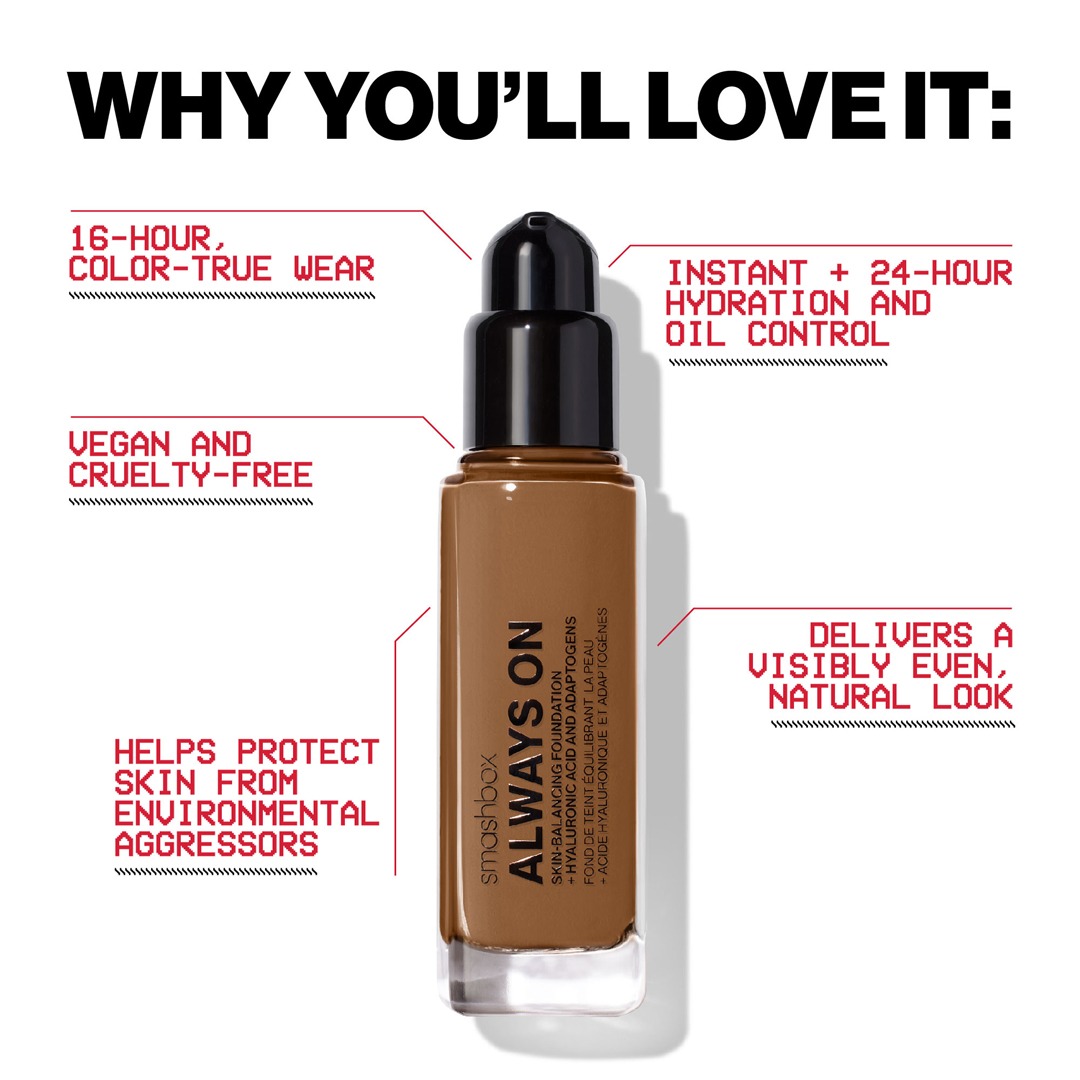 Þessi fljótandi farði inniheldur Smashbox Balance Boost Complex með hýalúrónsýru sem veitir samstundis raka og í 24 tíma. Þetta raka- og aðlögunarefni hjálpar húðinni að vinna eins og sjálfvirkur hitastillir til að koma jafnvægi á olíu- og rakastig. Formúlan veitir miðlungs til fulla þekju og veitir náttúrulega áferð sem jafnar húðtóninn.